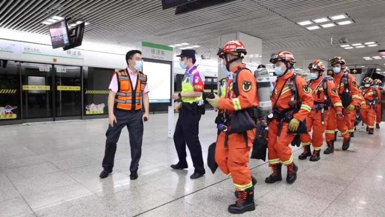 消防队员携带多功能担架、移动照明灯、便携式破拆工具等救生器材进入地铁站厅;轨道公安民警拉起警戒线;消防队员和地铁工作人员抵达地铁迫停处,有序引导乘客走出车厢,沿安全通道迅速撤离。