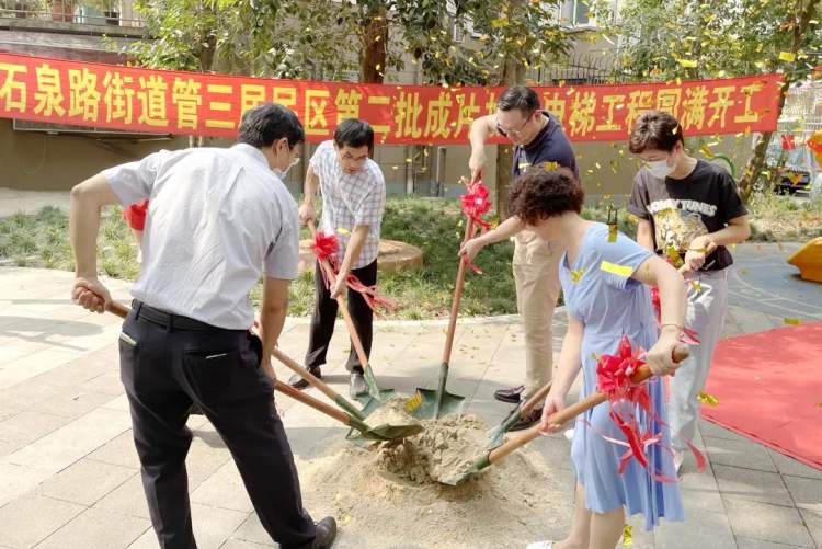 日前,石泉路街道管三居民区举行加装电梯开工仪式。不少居民听说这一好消息,纷纷前来一同见证和分享实现“加梯梦”的喜悦。 9月28日中午,石泉路街道举行管三居民区第二批成片加装电梯工程开工启动仪式,街道办事处主任何家骥、中山物业经理张臻、街道办事处副主任周晶、西部集团物业部经理陶纹出席仪式,并与施工单位、业委会、居民代表挥锹培土,为加装电梯开工奠基。