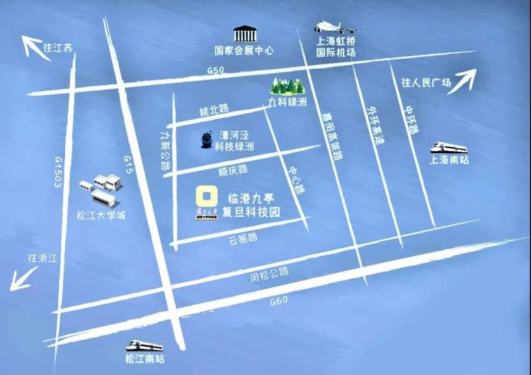 临港九亭复旦科技园由复旦大学国家大学科技园、临港集团和松江区九亭镇人民政府三方共建,位于上海市重点产业园松江漕河泾园区,身在“大虹桥”,紧邻G60科创走廊起点,区域交通四通八达,与长三角乃至全国地域链接紧密便捷。