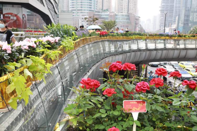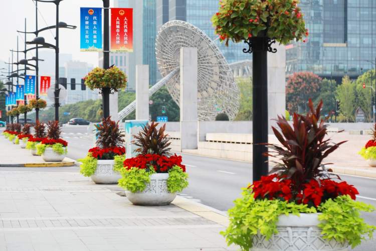 花坛花境选用的植物品种亮点不少,除了常用的大花海棠、一品红、一串红等草花,今年还选择了三角梅、向日葵“无限阳光”等花卉,既寓意良好,又花型丰富,颜色艳丽,提升了国庆的绿化景观氛围。