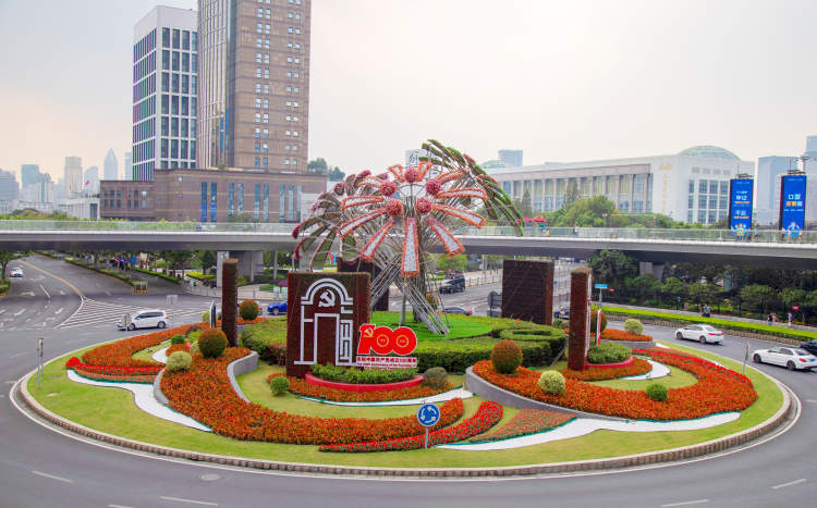 国庆的花卉布置特色鲜明,首先是延续建党百年元素,在陆家嘴环岛、徐家汇等申城多处都能看到建党百年、国庆元素交相呼应,继续让“中国红”飘扬在上海的各个街头绿地。