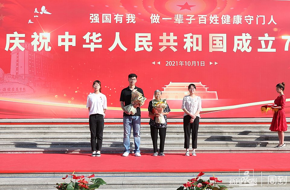 如今,77岁的王桂珍虽已是一头银发,精气神却依旧十足。站在国旗下,面对朝气蓬勃的上健医青年学子,她用“上海浦东话”道出谆谆嘱托。
