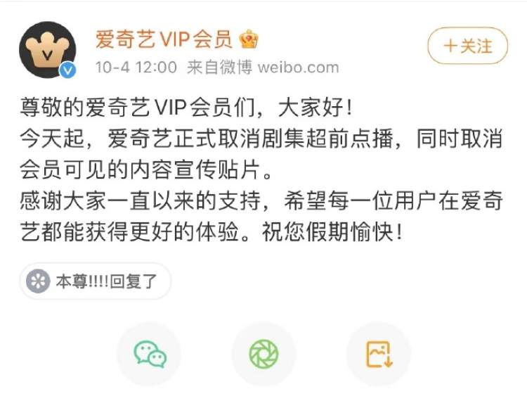 一直摸索中发展的视频网站超前点播服务,今日迎来新的变局——10月4日中午12点,爱奇艺方面发布消息,正式取消剧集超前点播,同时取消会员可见的内容宣传贴片。
