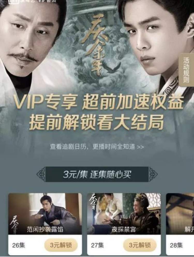 2019年12月,热播剧《庆余年》在付费的方式上进一步升级。这部长达43集的作品在播出过半时就启动了超前点播,VIP会员可以通过3元/集或一次性支付50元的形式购买超前点播内容。