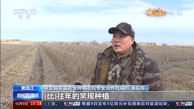 依安县农喜农业种植农民专业合作社成员 张红军:(比)往年的常规种植高(增)产一百四五十斤,增产200多块钱一亩地。现在我们全村耕地全部入了合作社,一亩都不留,大豆收完就开始翻地了。