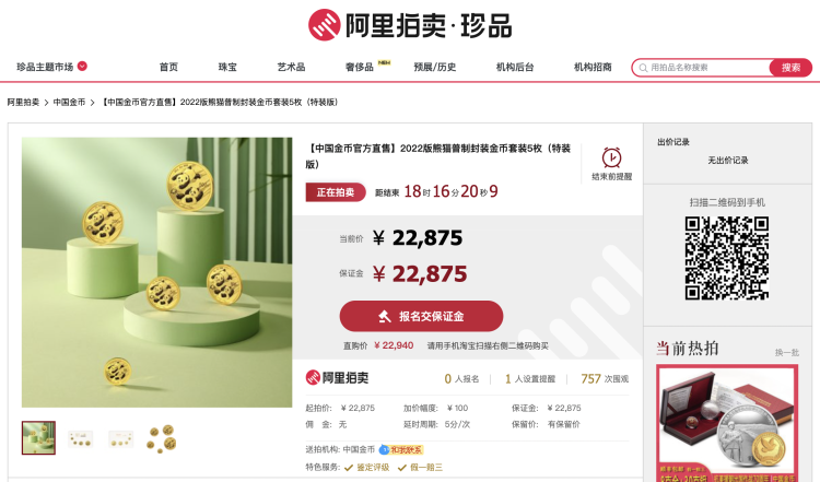 记者注意到,发行仪式当天,2022版熊猫普制金币已同步上线阿里拍卖,由中国金币总公司官方拍卖店“中国金币”直接销售,这也是中国金币总公司在第三方电商平台的第一店。店铺首推6个品种,分别为2022版熊猫5枚金币套装,30克、15克、8克、3克和1克的普制金币。