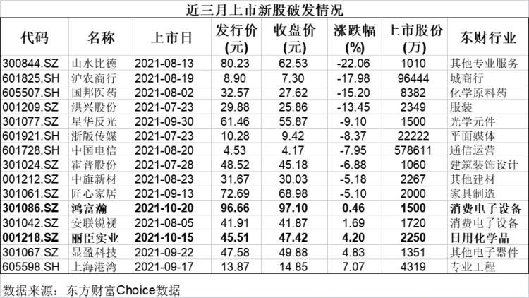 统计显示,近三月在A股上市的117只新股中,10只已经破发,破发幅度最大的创业板新股山水比德,发行价80.23元,21日收盘价62,53元,破发22%;9月30日上市的星华反光上市第三个交易日即破发;安联锐视、显盈科技、上海港湾等个股濒临破发。