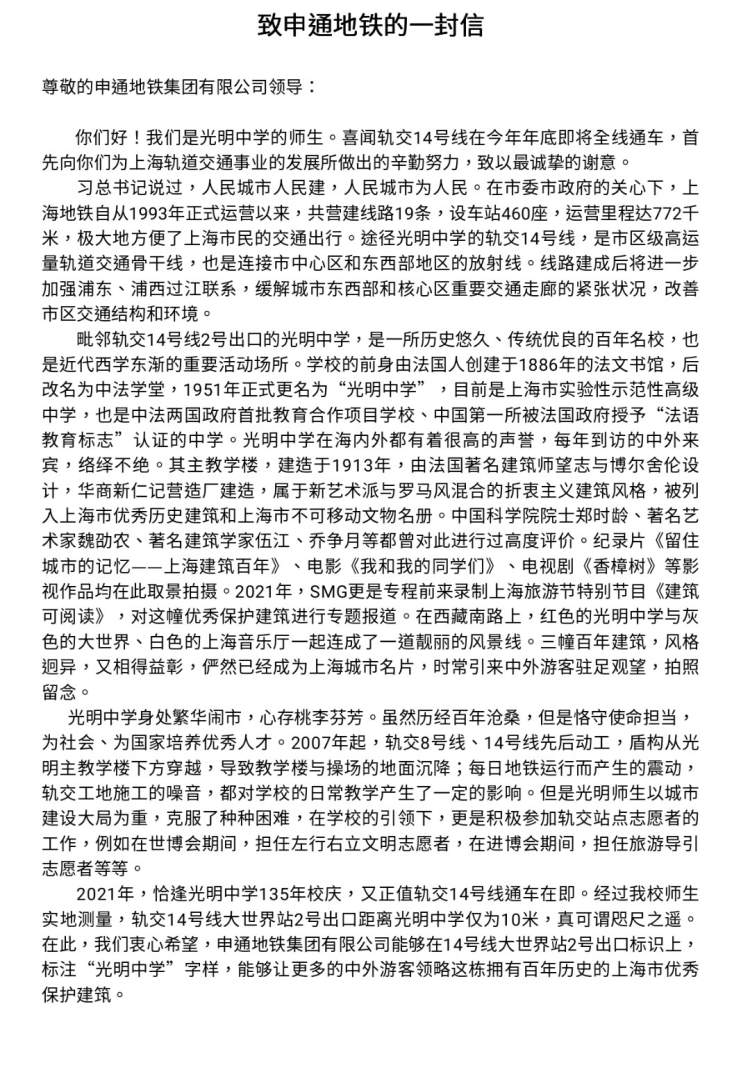 这节课的缘起,来自于学生们的一个提议。原来,地铁在建14号线大世界站2号出口离学校又很近,于是学生们突发奇想,“能不能向地铁方建议,在出口标识上加入‘光明中学’的字样呢?”