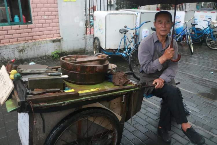 这天的大雨中,王宝珍没有等来一个顾客,“雨小了再去其他地方转转。”对于74岁的王宝珍来说,磨刀不仅仅是糊口的职业,更是一种丢舍不下的习惯。即使岁月将人的棱角磨平,但永远不会改变人热爱生活的态度,推车上褪色的塑料玩具就是最好的证明。