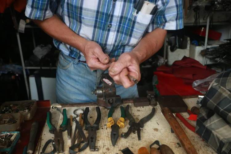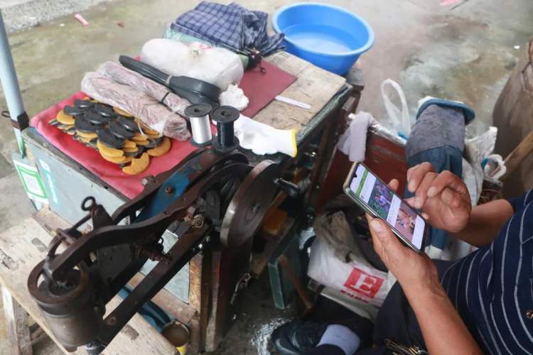 一方矮桌,一把木凳,一只拐杖,一双凉拖构成了小摊位。没有生意的时候大字不识的吉师傅会刷会儿手机,看看短视频,“自学的,像我们这种人也要自力更生,靠别人是不行的。”