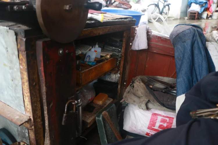 在李记修伞的马路对面(隆昌路一角),有个两平米不到的修鞋摊。修鞋匠名叫吉和德,今年67岁,江苏宝应人。在吉和德两岁的时候,一场大火让他失去了右腿。为了讨口饭吃选择来到上海,二十多年来以修鞋为生。