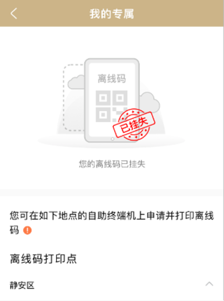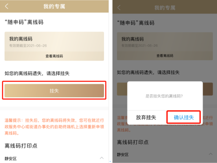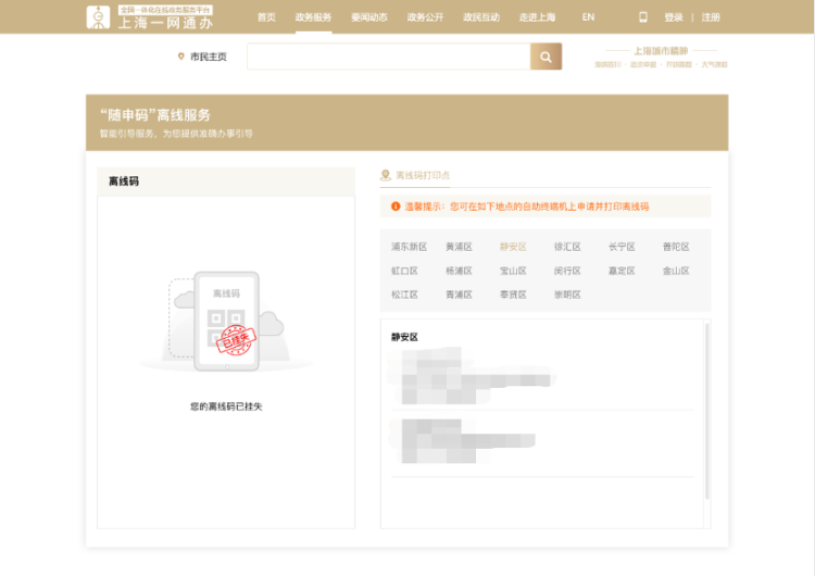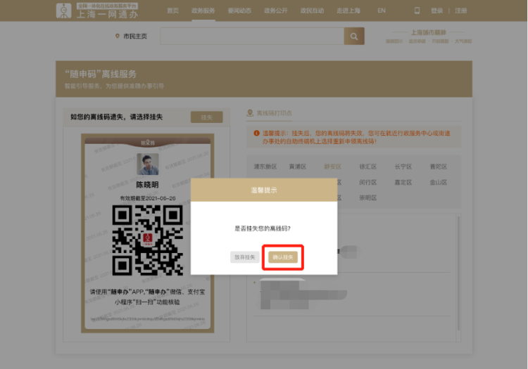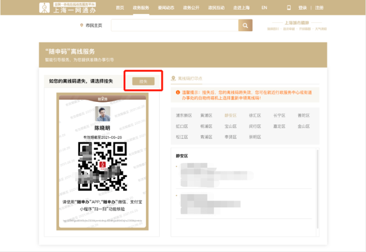 升级后的“离线码”具体如何领取?如何使用?遗失了怎么办?详见↓ 可领取人群:“随申码”亮码页面内有照片的以下人群:①60周岁以上(含60周岁)老年人 ②本市户籍持证残疾人。 领取说明:凭身份证至各区行政服务中心、社区事务受理服务中心等提供“一网通办”综合自助终端服务的线下窗口,在自助终端机自行申请并打印即可,有效期为180天,过期失效,需重新领取。 2、办理人在自助终端选择“身份证登录”或者“随申办登录”,使用身份证或“随申码”完成身份认证,申领“离线码”; →身份证登录:在身份证读卡区放置身份证,完成身份认证。 →随申办登录:在二维码扫码器处展示“随申码”,完成身份认证。 第二步:确认屏幕展示“离线码”内容;办理人可在此页面核对姓名、照片等信息; 温馨提示:如您在申领过程中,发现照片、姓名等信息有误,可以联系线下窗口工作人员。 第三步:确认无误后,点击“申领”,通过自助终端打印“离线码”。 第一步:办事人在自助终端上通过刷身份证或扫描“随申码”进行身份认证; 第二步:确认屏幕展示“离线码”内容; 第三步:确认无误后,点击“补领”,通过自助终端打印“离线码”,选择“补领”后,之前申领的“离线码”将失效,无法进行核验。 为保障用户数据安全与隐私,核验页面的被扫码人信息为脱敏状态,同时,核验页面自带扫码人信息水印,以防止扫码人截图转发。 一、“一网通办”PC端 1.登录“一网通办”PC端(https://zwdt.sh.gov.cn/)。 2. 点击姓名,进入“我的主页”。 3.点击“智能推荐”——“随申码”离线服务,进入挂失页面。 注:已申请过“随申码”离线服务(离线码)的市民,才会在此页面显示入口。 4.点击“挂失”,在弹出的提示框中点击“确认挂失”,即可挂失成功。 二、移动端 1.登录“随申办”APP或“随申办”微信小程序或“随申办”支付宝小程序,在首页点击“专属”,进入“我的专属”。 2.点击“信息&材料”——“随申码”离线码,进入挂失页面。 注:已申请过“随申码”离线服务(离线码)的市民,才会在此页面显示入口。 3.点击“挂失”,在弹出的提示框中点击“确认挂失”,即可挂失成功。