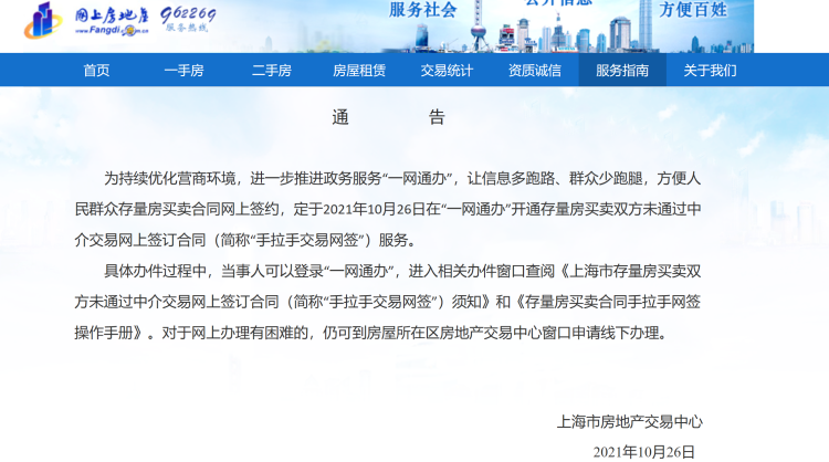 不通过房产中介也可以买房啦?上海市房地产交易中心官网“网上房地产”发布公告称,10月26日在“一网通办”开通存量房买卖双方未通过中介交易网上签订合同(简称“手拉手交易网签”)服务。