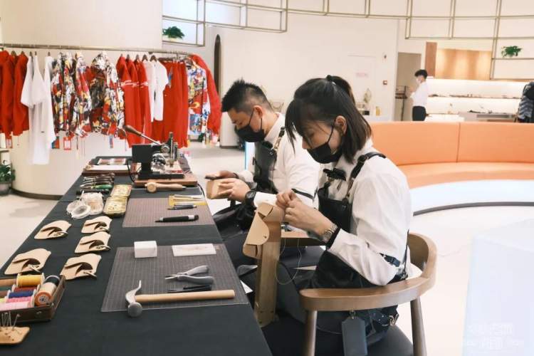 在展示区,有两位工艺大师正在为顾客们展示手工皮具的制作过程,寺库特有的匠心理念尽显。