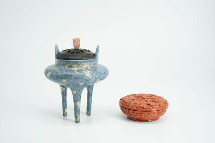 吴清:这次展出的香事用具来自于全国各省市自治区,从材质而言有陶瓷、玉石、竹木、角质类、金属等,其中以陶瓷为主,国内著名的传统陶瓷产地景德镇、龙泉、宜兴等均有非常优秀的作品参展,其中,仿宋代湖田窑影青瓷鸭熏、仿宋元龙泉青瓷狮钮熏炉、彩绘海水神兽三足炉、仿剔红雕漆落花流水香盒等均为目前国内外同类香器具中的顶级精品。