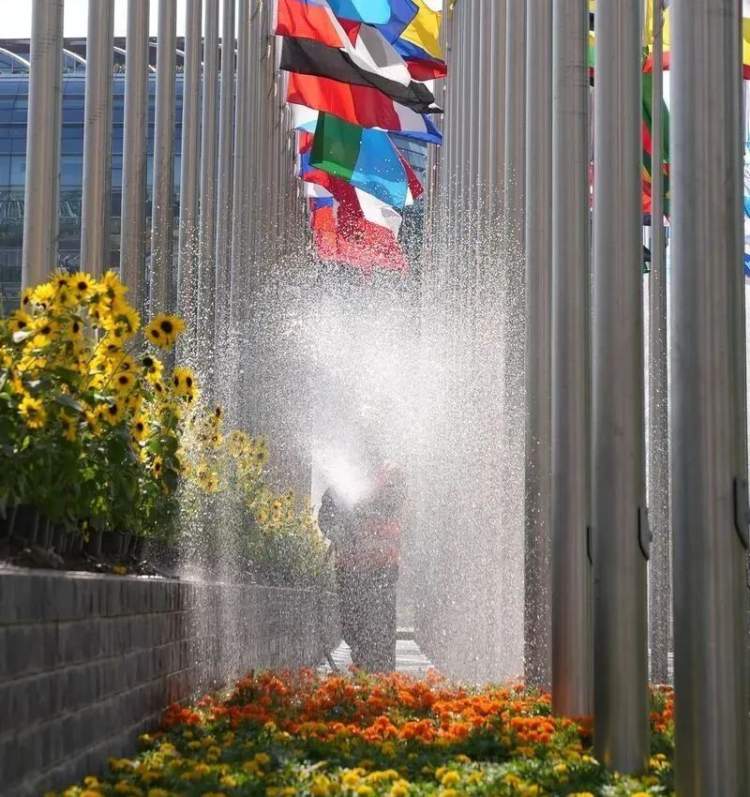 巨型花柱是南广场的标志性景观,它们共8根,直径1米、高8米。柱身采用渐变色,镂空雕刻32种“你好”的语言。再往前走,就能看到一幅展现中国锦绣缤纷自然之美的画作。自上而下营造“云山—梯田花海—河流—现代城市花园”四个空间脉络,采用不同色系的植物进行妆点。