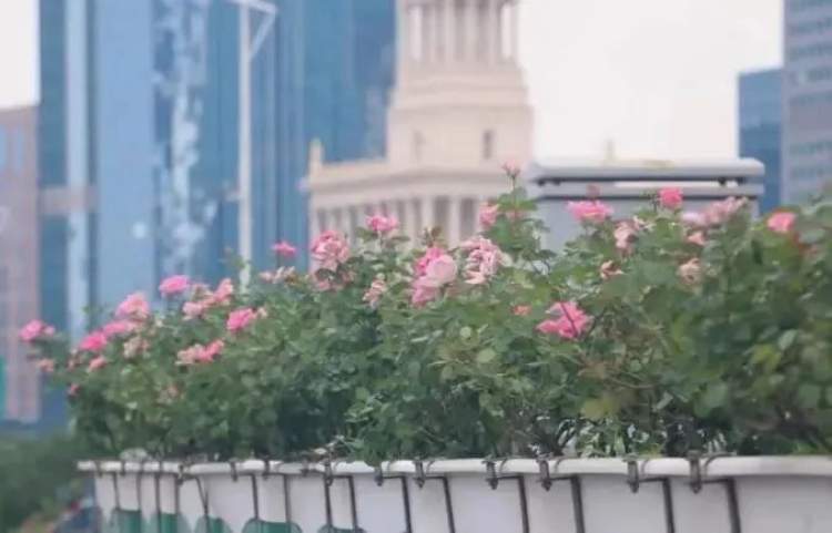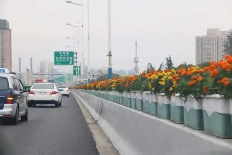 本次高架摆花首次采用“单线+组合”的摆放形式,花卉品种涉及三角梅、月季“仙境”、比格海棠、孔雀草和亮金女贞等。其中,外滩至延中立交、延西立交至沪青平立交以三角梅为主。延中立交至延西立交采用组合摆放,运用5盆比格海棠红花绿叶+3盆亮金女贞的组合模式。沪闵高架路以月季“仙境”为主,部分路段采用三角梅+亮金女贞组合、橙色孔雀草+黄色孔雀草组合。
