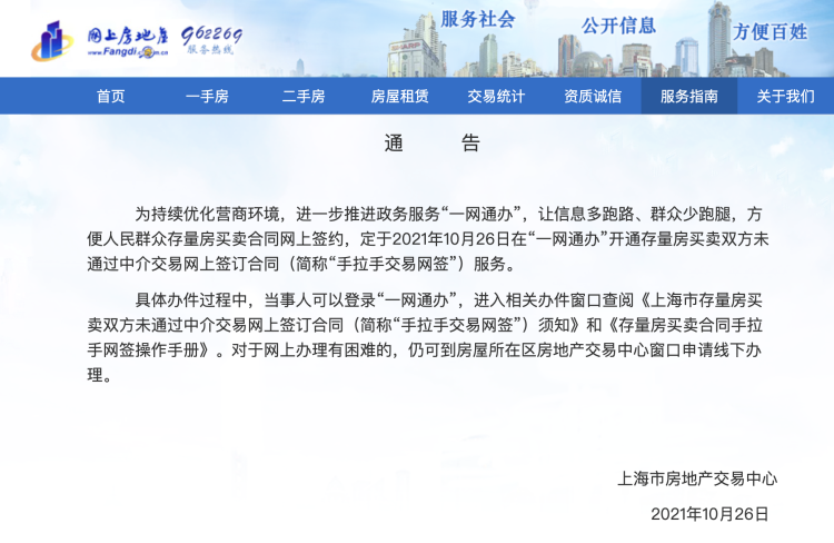 10 月 26 日,上海市房地产交易中心发布通告,在 " 一网通办 " 开通存量房买卖双方未通过中介交易网上签订合同(简称 " 手拉手交易网签 ")服务,让信息多跑路、群众少跑腿,方便人民群众存量房买卖合同网上签约。