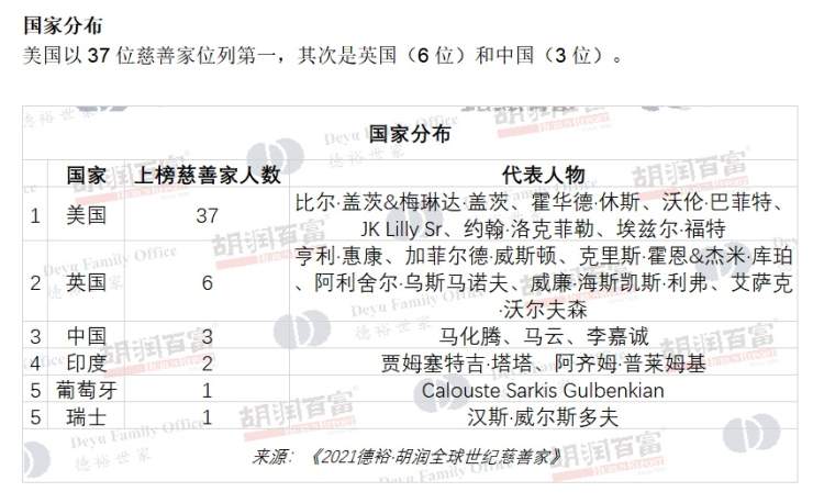 该报告显示,一百多年来全球捐赠价值最高的50人来自七个国家,美国以37人居首,其次是英国6人,中国3人,印度2人,葡萄牙和瑞士各1人。他们的捐赠总价值达5.2万亿,其中3.2万亿是他们基金会当前的资产价值,2万亿是迄今已拨付的捐赠。13位在世,37位已去世。