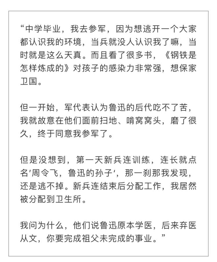 “后来上学了,当上到鲁迅的课文,大家知道了我的背景之后,我就在众目睽睽之下每天被‘指指点点’。”