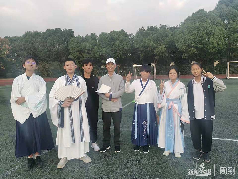 天空湛蓝,精美的风筝自由飞翔在其中,操场上穿着汉服的师生们快乐奔走,偌大的校园里一派欢乐景象。