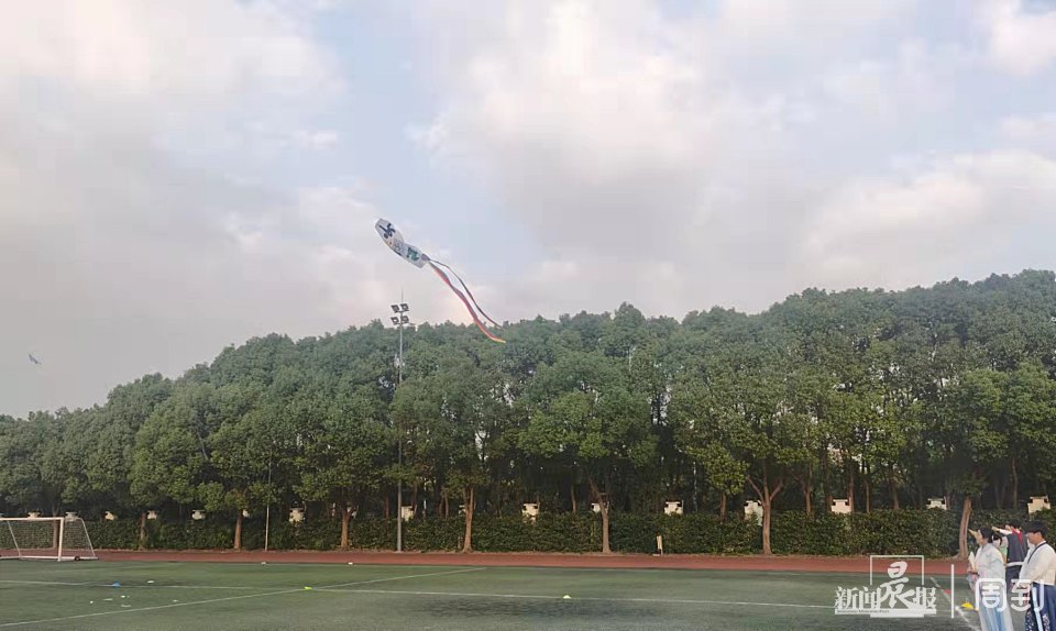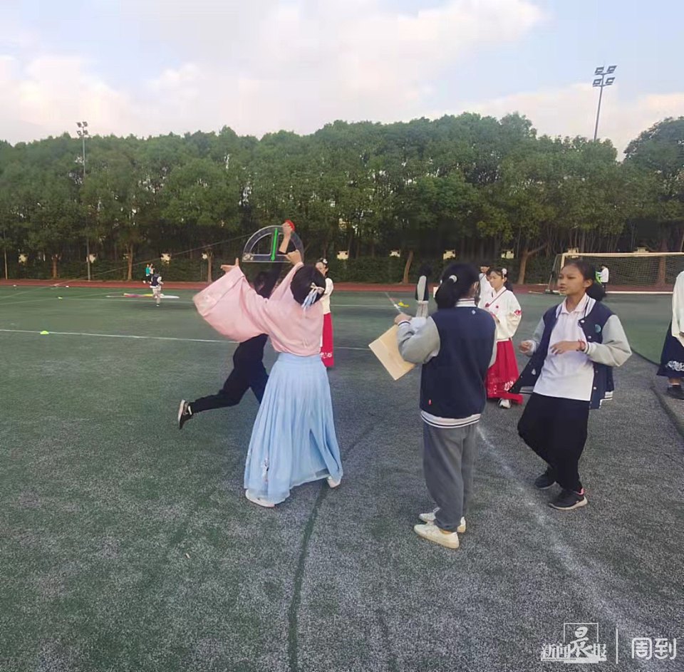 操场上,穿着汉服的同学们扯着风筝线,在风中奔跑,风筝越飞越高,学生裁判跟在风筝线旁,举着量角器测量数据,校园的快乐在这一刻定格。