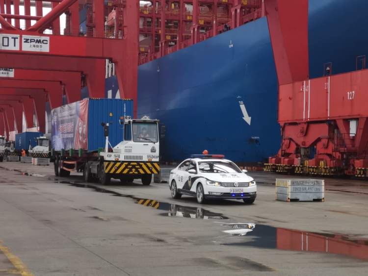 10月13日上午10时,在现场民警的指挥下,载有进博物资的集装箱卡车在警车的护送下顺利卸至专用箱位,整个作业过程衔接得当、井然有序。