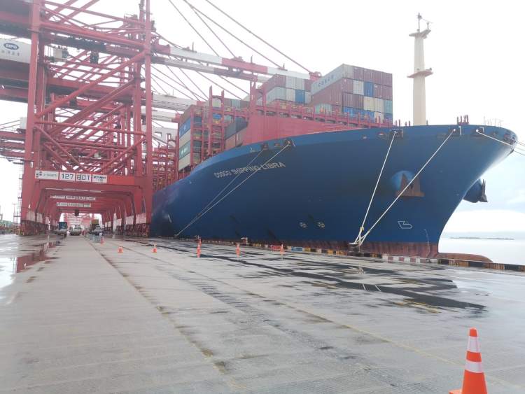10月12日18时,经过20多天漂洋过海后,载运着本届进博会首单大型展品的中国香港籍中远海运“天秤轮”顺利靠泊洋山港二期码头。
