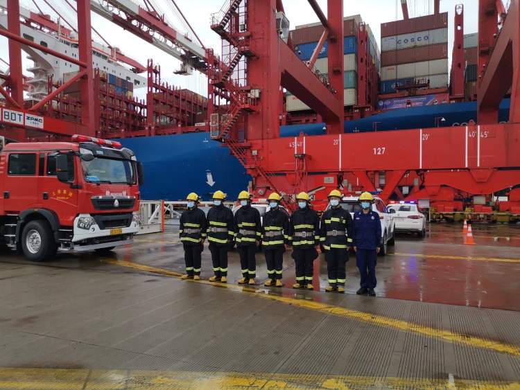 为了防止物资在装卸过程中发生意外碰擦或坠落事故,除了民警在现场监护外,还动用了港区消防车,按照危险品装卸级别全程监护,随时做好抢险准备。集装箱装载完毕后,在不影响场区其他作业的情况下,由警车引导一路“护送”至专用箱区。