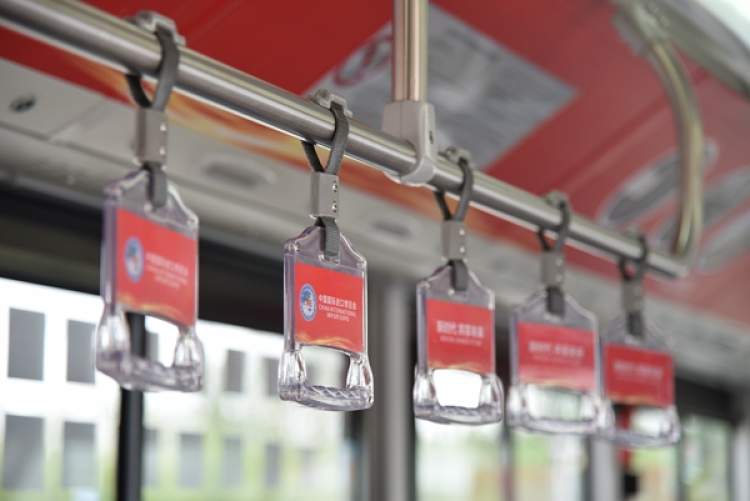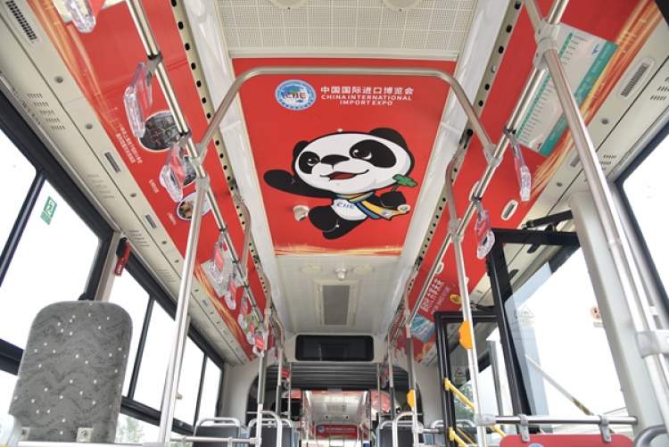 记者发现,“进博主题专车”车厢内,与进博主题相关的装饰令人目不暇接,步入车厢就能感受到喜迎进博会的气氛。工作人员以进博会吉祥物“进宝”为设计元素,对车厢整体进行了全新布置,红色基调十分醒目。进博会海报张贴在车厢顶部;车厢两侧有上海著名景点的图片。车厢的布置还呈现着上海“海纳百川”的城市魅力。
