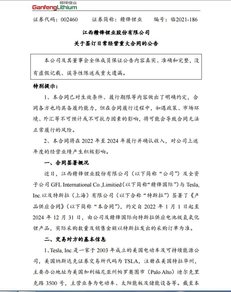 此外,11月1日晚间,赣锋锂业宣布,再度斩获特斯拉3年大单,将在2022至2024年间为特斯拉供应电池级氢氧化锂产品。公司称,合同的签订有利于强化公司与特斯拉之间长期稳定的合作关系,有利于提升公司的持续盈利能力,有利于公司长远发展。合同将在2022 年-2024 年履行并确认收入,对公司上述年份的经营业绩产生积极影响。