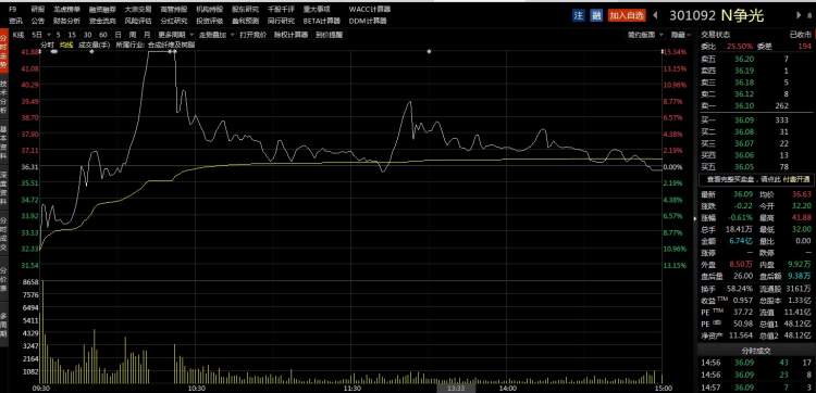 11月2日,两只创业板新股争光股份(301092)、瑞纳智能(301129)上市。其中争光股份竞价低开11.32%,瑞纳智能竞价平开。争光股份是连续8个交易日第9只新股破发。不同的是,该股破发后突然一度暴涨30%临停;复牌后又开始下跌、午盘拉升后仍破发,最后收报36.09元,破发0.61%,全天换手率58.22%,居沪深两市之首。