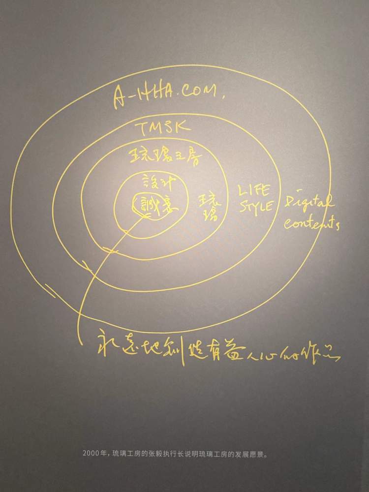 墙上还有一幅放大的手稿,靶子一样的思维导图,那是2000年时,张毅手绘的琉璃工房事业愿景。靶子的中心,不是工艺、创作、设计或生活方式,而是“诚意”两字,在张毅内心,琉璃工房不是工艺品企业,它的使命是“永远创造有益人心的作品”。