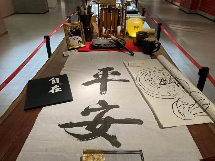 展厅桌上摊放着张毅写的书法,旁边是笔墨砚台,好像是张毅刚写完,跑出去喝一口茶的样子。