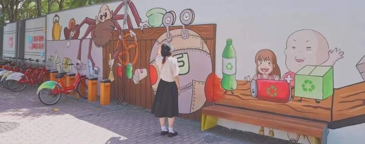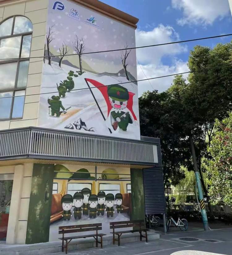 除了在唐顿庄园集中展出的椅子外,还有2处城市公共空间艺术椅子打卡互动点:韩村路上的千与千寻墙绘以“环保、再生”为主题,响应了世界城市日“应对气候变化,建设韧性城市”的主题;韩村路与环城东路交界处的墙绘,以“长津湖”为背景,以奉浦IP“小浦”为形象,勾勒出军人远征时坚毅团结的中国力量。也为常常在此等候的外卖小哥、城市环卫工人们提供休憩空间。