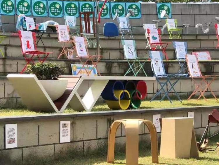 同济大学主导的师生们为了支持孩子们的创意,也配合展出了大批实体创意座椅,其中包括几十把设计创意学院“莫娇和她的学生们”系列座椅、周洪涛和张丁伟全球首发的35颗钢钉系列座椅、上海工艺美术职业学院邢岩老师的系列玩具椅、江南大学时迪老师的“春”字椅、河西学院侯婕老师的空竹椅、美国Art Center College of Design Amanda Sutanto的蒸笼椅以及社会各界支持的各类座椅,展览还收集到了台风季社区里倒掉的树干,切成可以坐的树墩椅,在现场让小朋友们进行现场彩绘和涂鸦,树干再次回到社区,艺术化的服务居民。