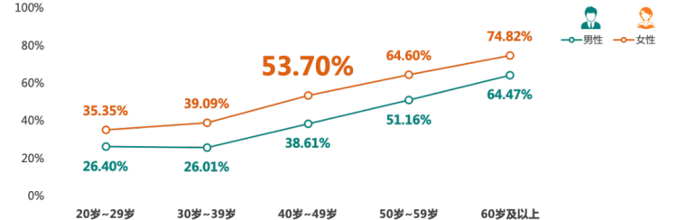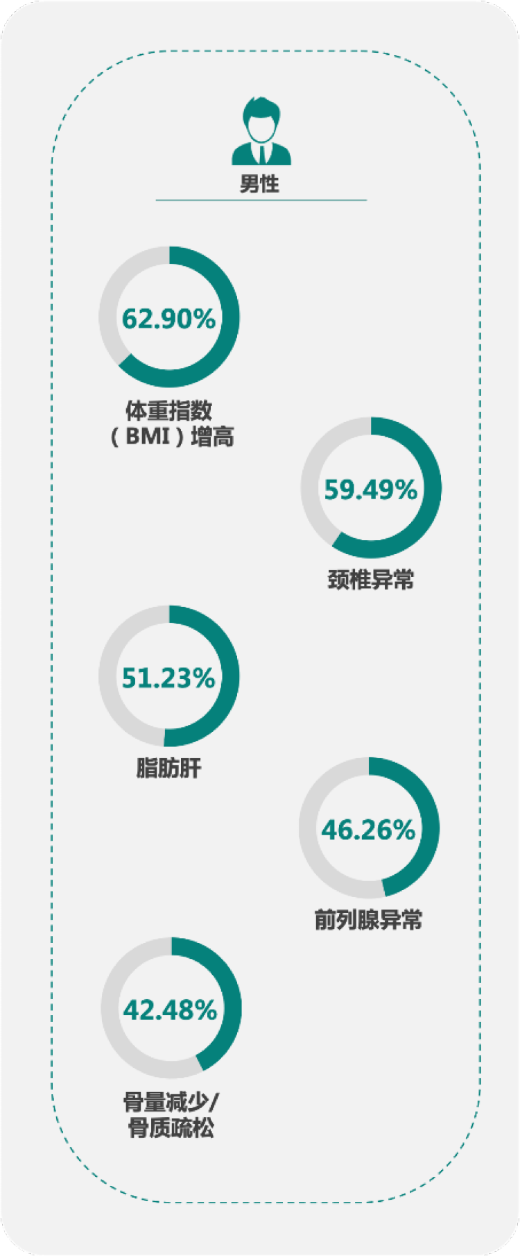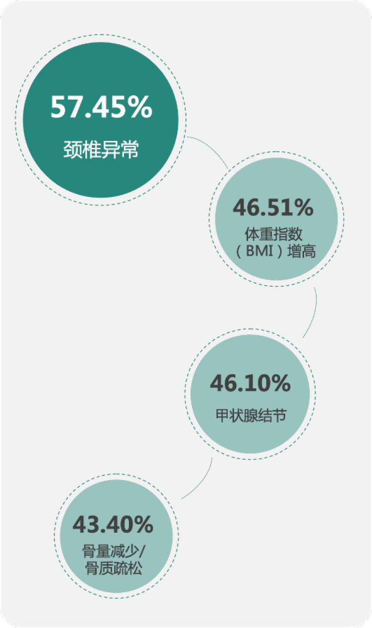 对于男性金融高净值客户,威胁最大的健康问题是体重指数(BMI)增高,检出率为62.90%,这可能与男性金融高净值客户的饮食、运动、吸烟和饮酒等生活方式相关;往下依次为颈椎异常、脂肪肝、前列腺异常和骨量减少/骨质疏松,检出率均超过40%。