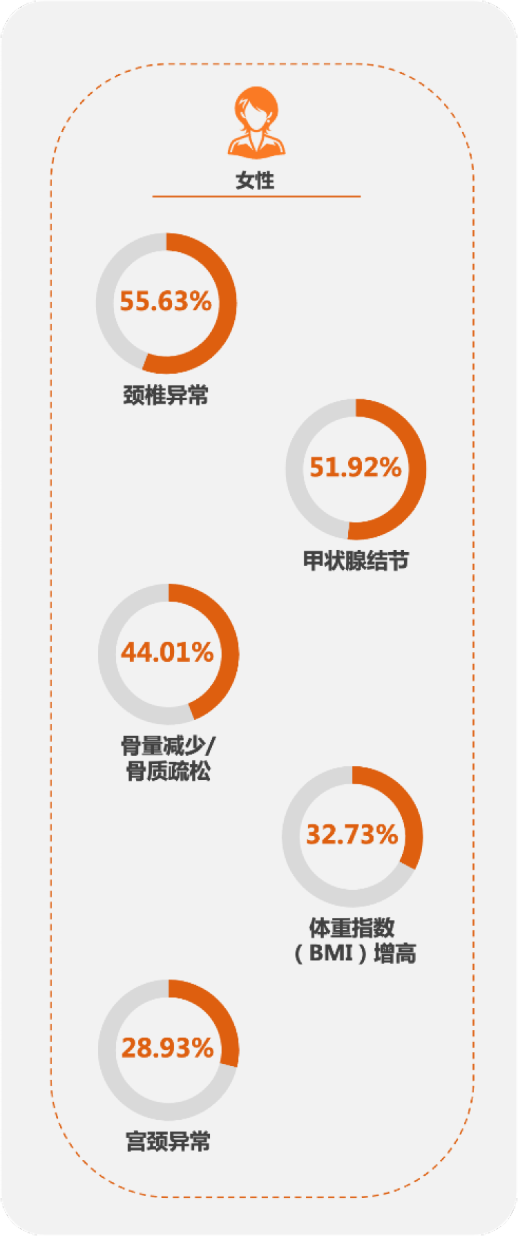 对于女性金融高净值客户,威胁最大的健康问题是颈椎异常,检出率为55.63%,这可能与女性金融高净值客户承受的工作压力和久坐习惯等相关;往下依次为甲状腺结节、骨量减少/骨质疏松、体重指数(BMI)增高和宫颈异常,检出率均超过20%。