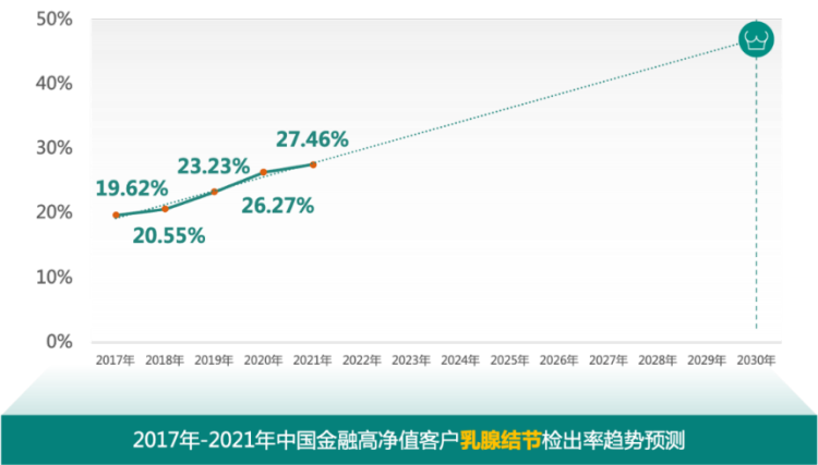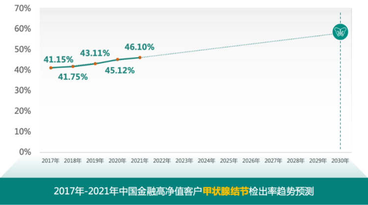 在不考虑人口年龄结构、国家卫生政策及其他影响因素变动的情况下,根据2017年-2021年金融高净值客户异常结果检出率初步预测,到2030年,甲状腺结节检出率将近60%;乳腺结节检出率将超过40%。这可能与女性金融高净值客户近年来在工作和家庭中承受越来越多的压力有关。