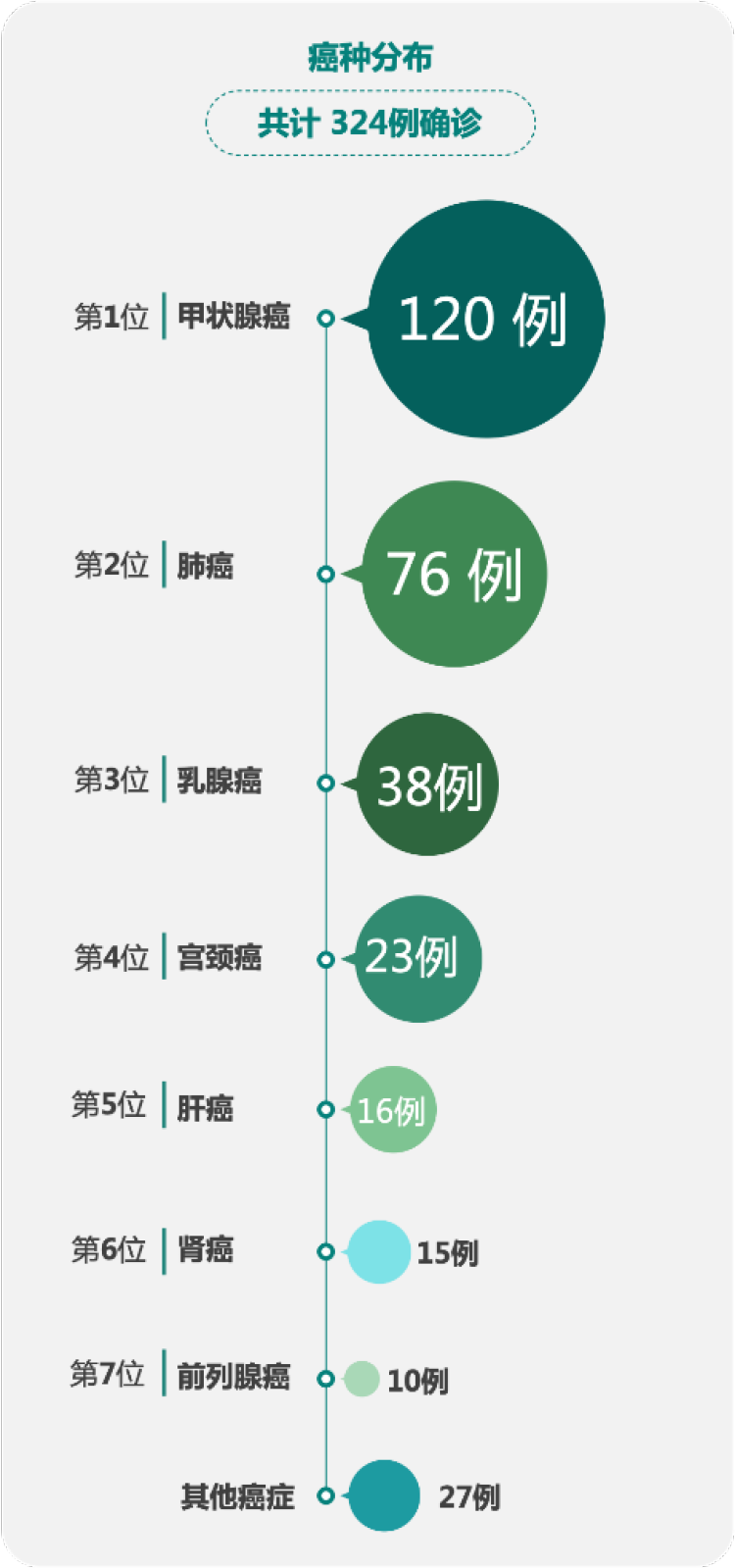2020年10月至2021年9月,在爱康旗下体检中心参与体检的约30万金融高净值客户中,通过对体检结果出现重大阳性的金融高净值客户开展追踪和随访。目前已经随访到324位客户确诊癌症,约每1,000名体检人群中有1名确诊癌症,其中甲状腺癌确诊人数最多,往下依次为肺癌、乳腺癌、宫颈癌和肝癌等。张黎刚表示:“追踪和随访后,有一些客户并没有将检查结果反馈给我们或因为某些原因没有去医院检查,因此我们认为在近30万客户当中,实际癌症患者会超过这个数字。”
