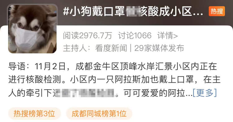 小狗戴口罩陪主人测核酸,意外火上了热搜榜。到底怎么肥事呢?