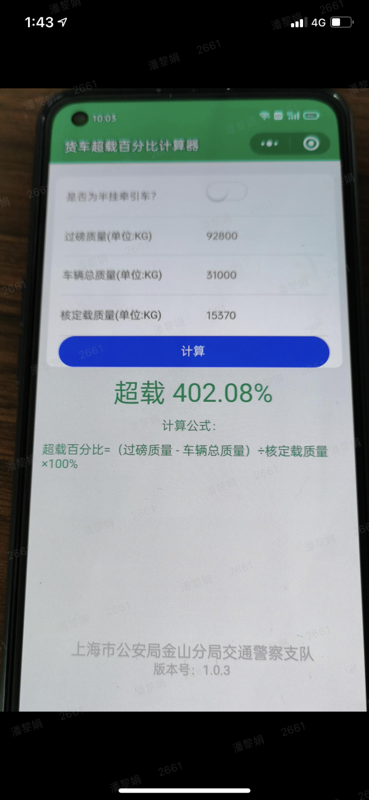 经对货车过磅核查,结果令民警大吃一惊,经民警严肃批评教育后被带至新卫路停车场过磅站过磅检测,该车核载15370KG,实际载重61800KG,超过核定载重高达402%。