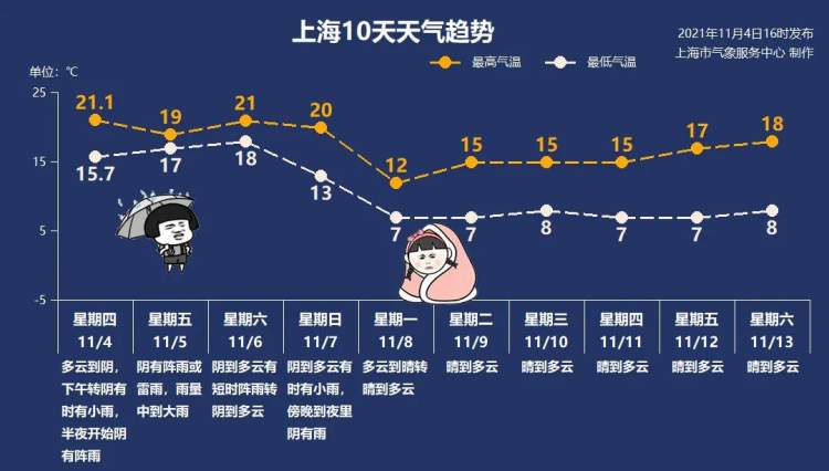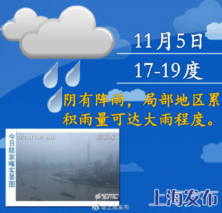好久不见的大雨 冷空气周日“到货” 周到君 2021-11-05 来源:周到上海 受冷暖气流交汇影响,今天阴有阵雨,局部地区累积雨量可达大雨程度,风力不小,东南风4-5级阵风6级,在雨水的打压下,最高气温略有下降,今天气温在17-19度之间。 明天白天降水短暂间歇,后天傍晚到上半夜,强冷空气到货,本市将出现大风、降温天气,请大家及时添加衣物,做好防范。 来源:周到上海 作者:周到君 赞一个 (0)