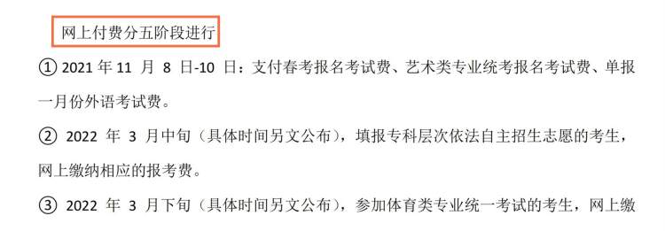市教育考试院透露,根据考试项目安排,网上付费采取分段付费方式。第一次网上付费安排在2021年11月8日-10日,主要针对勾选参加春季考试、单报1月份外语考试、艺术类专业统一考试的考生。
