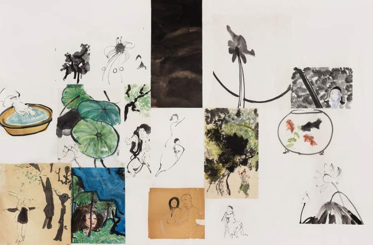 而由多幅手稿集合而成的《浮光连莲》,是此次展览作品中为数不多的淡彩画作,花朵人物、抽象具象、重叠碰撞,简单几笔,生动自在,沉浸在自己的世界中。