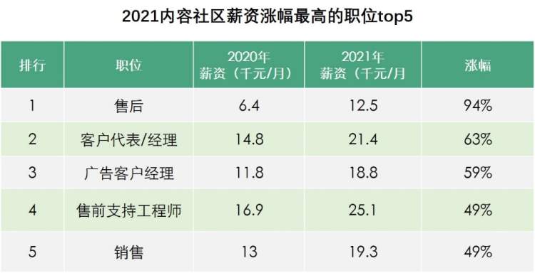 此外,2021年内容社区薪资涨幅最高的职位top5中,商业化职位占据3个席位,内容社区的商业化需求明显。