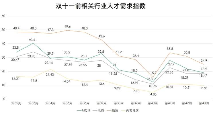 拉勾招聘数据显示,今年双十一前夕,四大相关行业的人才招聘需求趋势走向基本一致。电商行业的整体招聘需求较去年缩减,但招聘周期性明显。从8月初(第32周),电商行业人才需求平稳,从9月中(第38周)需求开始下跌,至10月初跌至低谷。