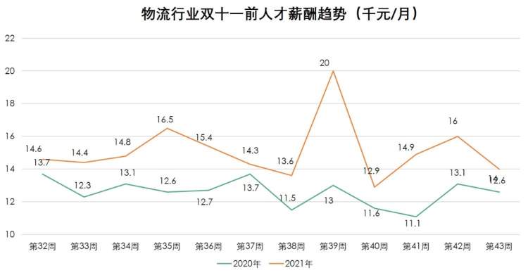 物流行业薪资趋势波动较大,10月底薪资达到峰值,较前一周环比增长47%。大促前12周物流行业的平均薪酬为15117元,较去年增长20%。值得注意的是,相较于去年,今年物流行业对兼职快递员的需求下降至55%,物流行业的人才储备趋于稳健。