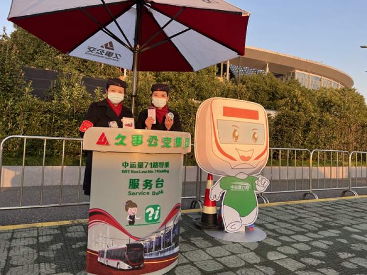这几天,在P1停车场内设置的“双语导乘服务台”也是一大亮点。进博会期间,车队每天安排2名导乘员在导乘服务台前,为中外展商和观众提供现场指路服务,并贴心准备了医药箱、雨披、热水、充电宝等应急物品。同时,还向参加展会的乘客发放印有中运量71路LOGO的钥匙扣、充电宝及U盘等精美小礼品。