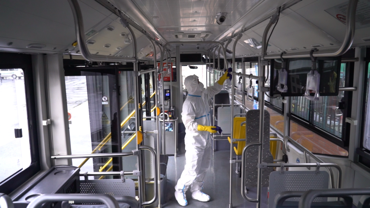 这几天,在国展中心P1停车场内,工作人员一丝不苟地对71路区间车厢进行全面消毒。据车队队长张卓告诉记者,根据国内疫情防控形势,为进一步全面完成进博核心区域的相关防疫目标,71路的车辆消毒,由原先的”一圈一消毒”改为“一程一消毒”。车队安排10余名消毒人员在P1停车场和黄陂北路终点站分别进行车辆防疫消杀。对车门把手、拉手、座椅靠背等人体易接触部位,通过“擦拭法”除菌与清洁。